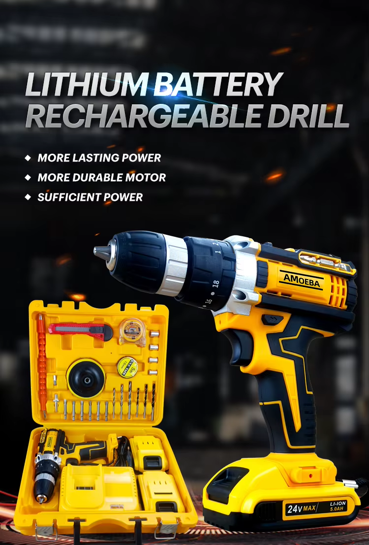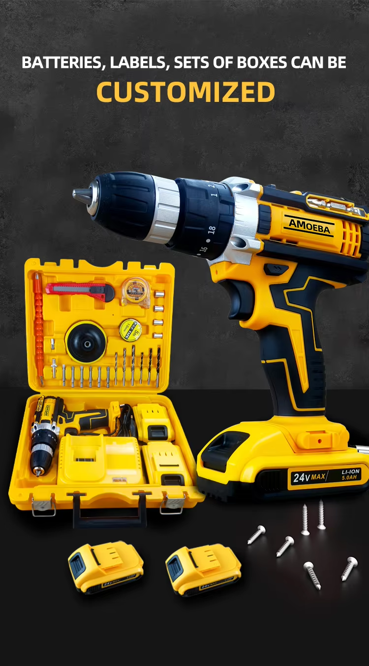 Good Quality 24 V Cordless Electric Drill Set with Impact Two Batteries One Charger Plastic Box Li-ion Cordless Hammer Drill
