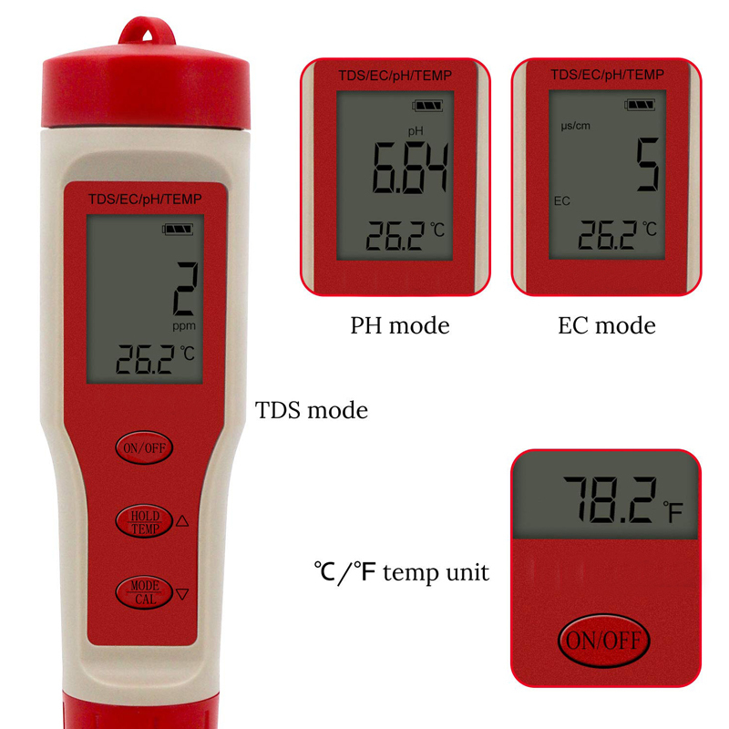 1.Measuring range: pH: 0.00-14.00pH; TDS: 0-19990ppm; CE: 0-19990 μS / cm